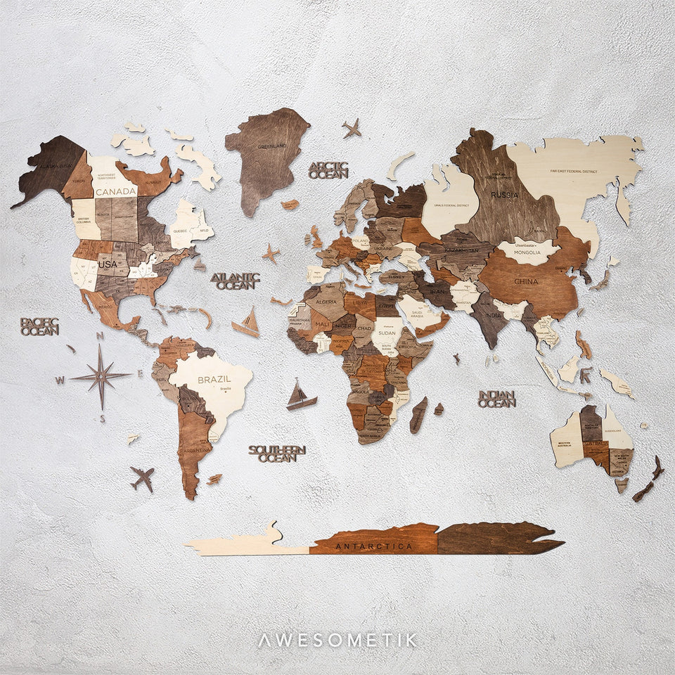 3D Perfection (3 wooden layers) 1. 3 layers for different countries 2. 4 different colors of wood pieces (light, brown, dark brown and light brown)