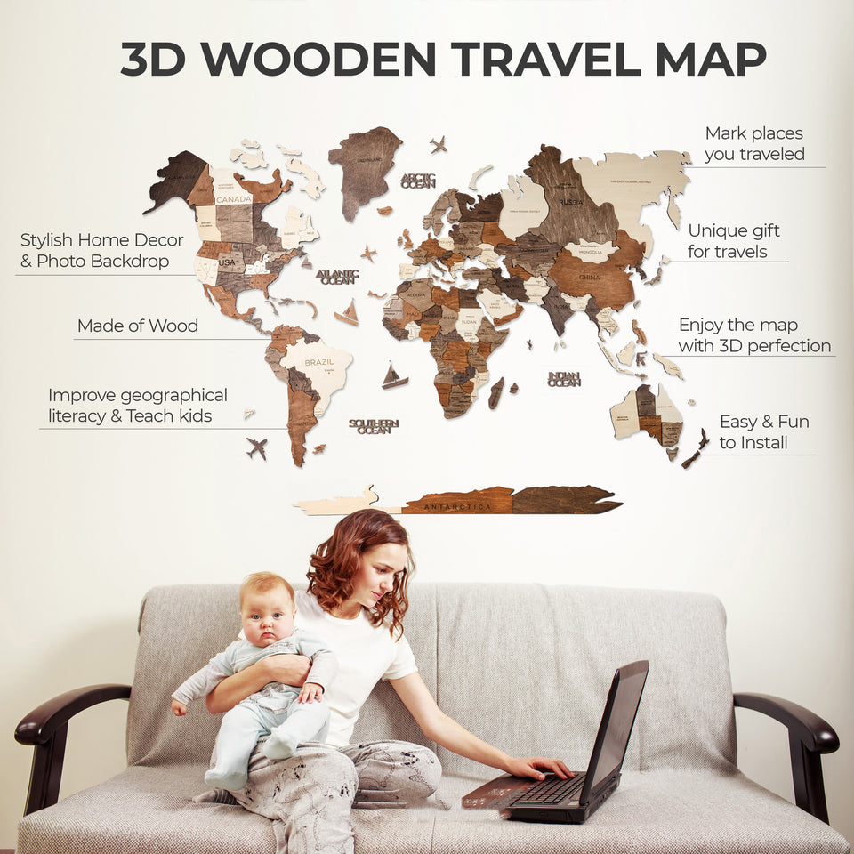 We hand make our design of a wooden world map paying special attention to quality and look. We are confident our travel maps will bring you happiness. We decorated our own houses with them and homes of so many people that we are certain you will be satisfied.